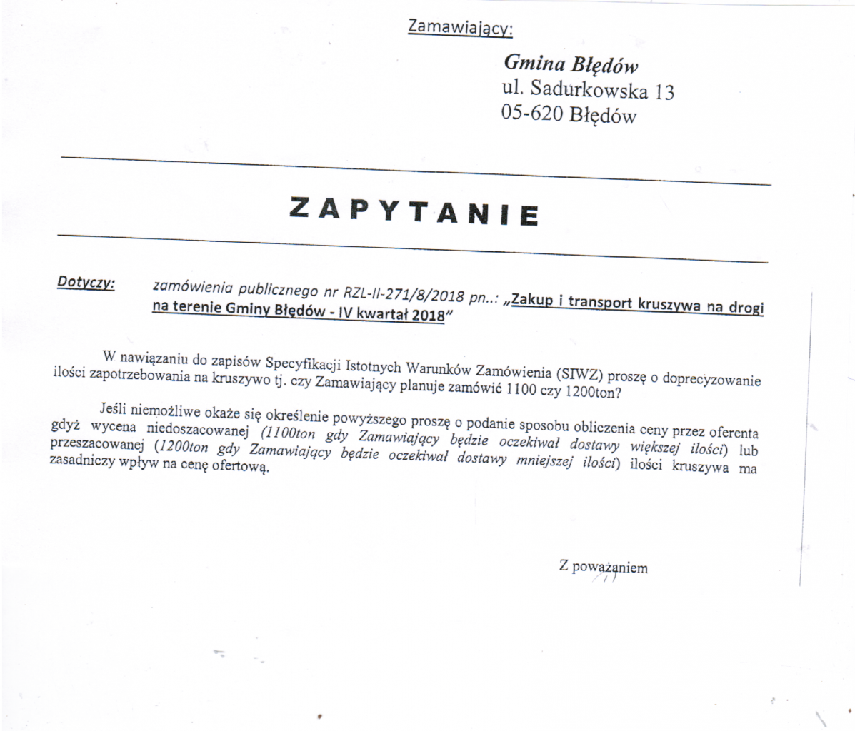 Wójt Gminy Błędów w odpowiedzi na zapytanie z dnia 06.11.2018 informuje że: W formularzu ofertowym należy podać cenę netto oraz brutto za 1 tonę kruszywa dolomitowego.