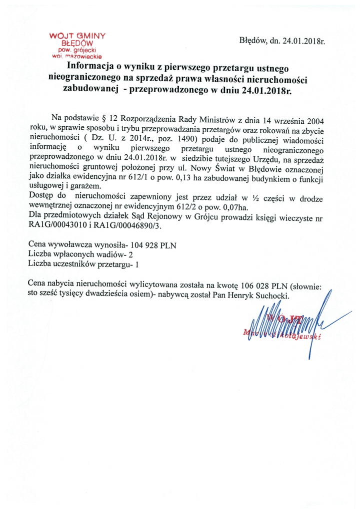 Informacja o wyniku pierwszego przetargu ustnego nieograniczonego na sprzedaż prawa własności zabudowanej.