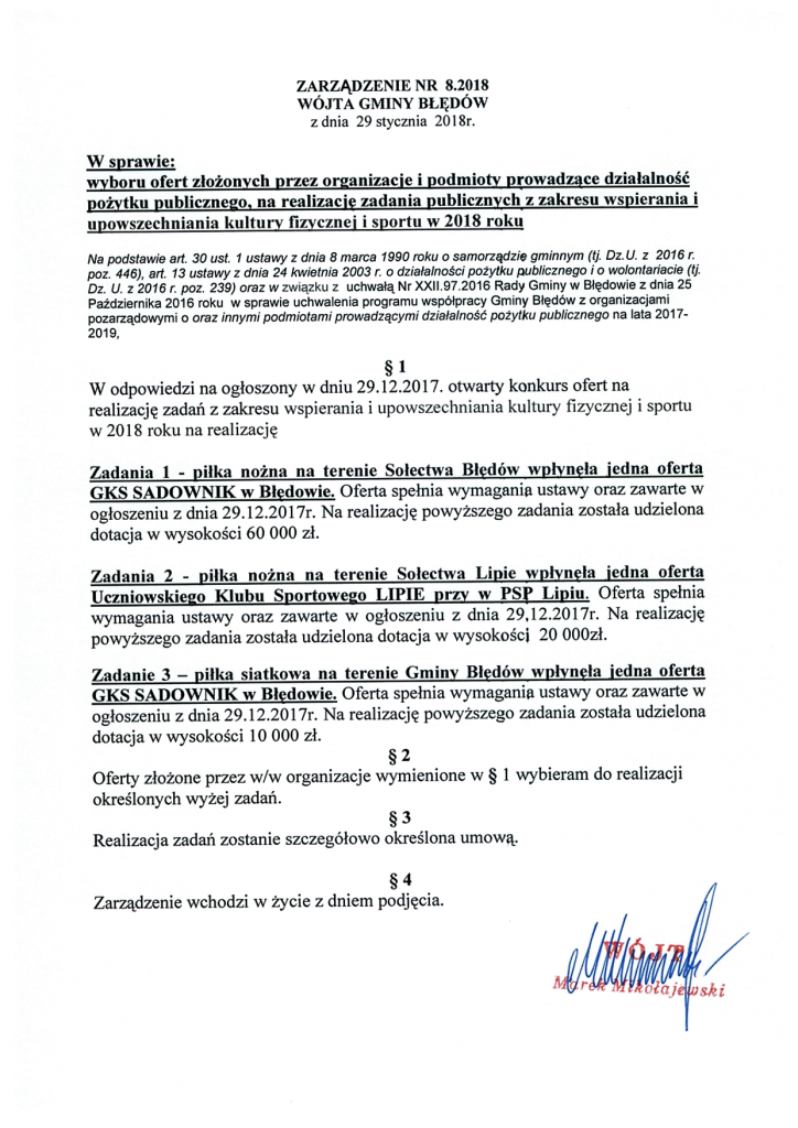 Zarządzenie Wójta Gminy Błędów nr 8.2018 z dnia 29.01.2018