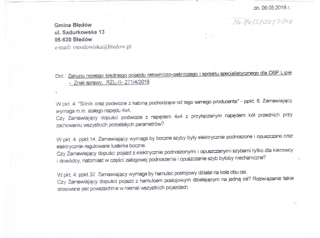 W odpowiedzi na zapytanie z dnia 09.05.2018 Wójt Gminy Błędów wyraża zgodę na zaproponowane parametry i udziela następujących odpowiedzi: