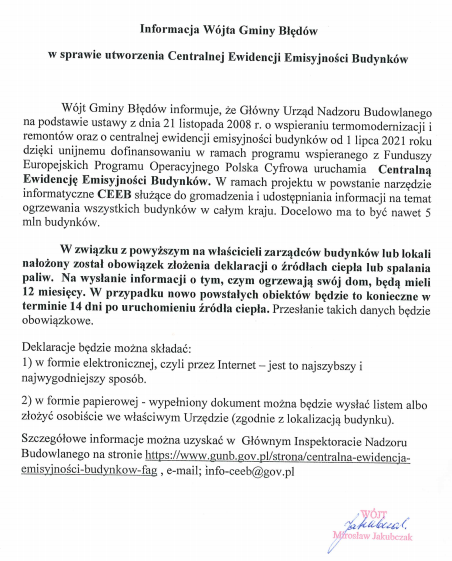 Informacja Wójta Gminy Błędów w sprawie utworzenia Centralnej Ewidencji Emisyjności Budynków