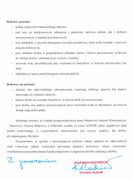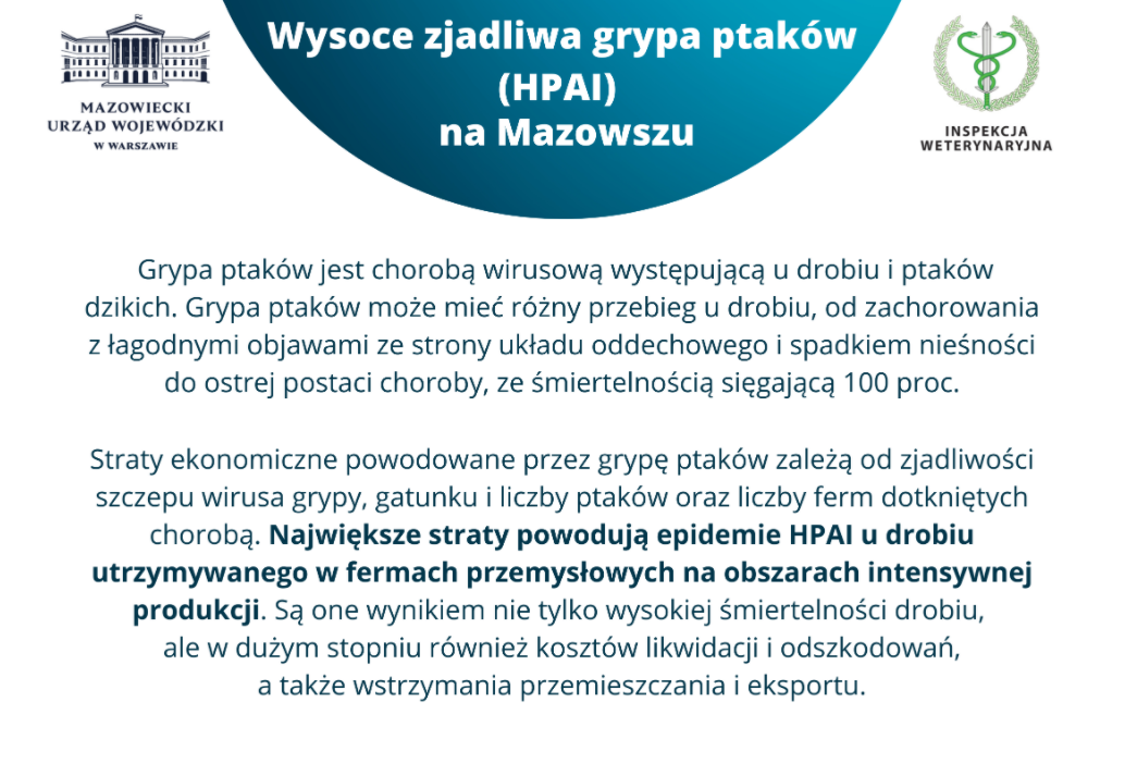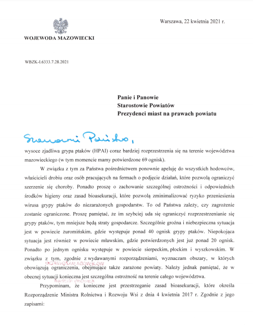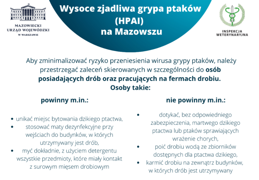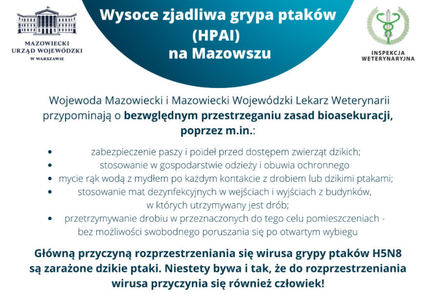 Apel Wojewody Mazowieckiego w sprawie ograniczenia rozprzestrzeniania wysoce zjadliwej grypy ptaków (HPAI)
