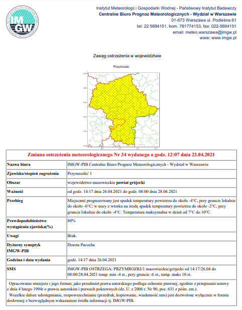 Zmiana ostrzeżenia meteo - przymrozki