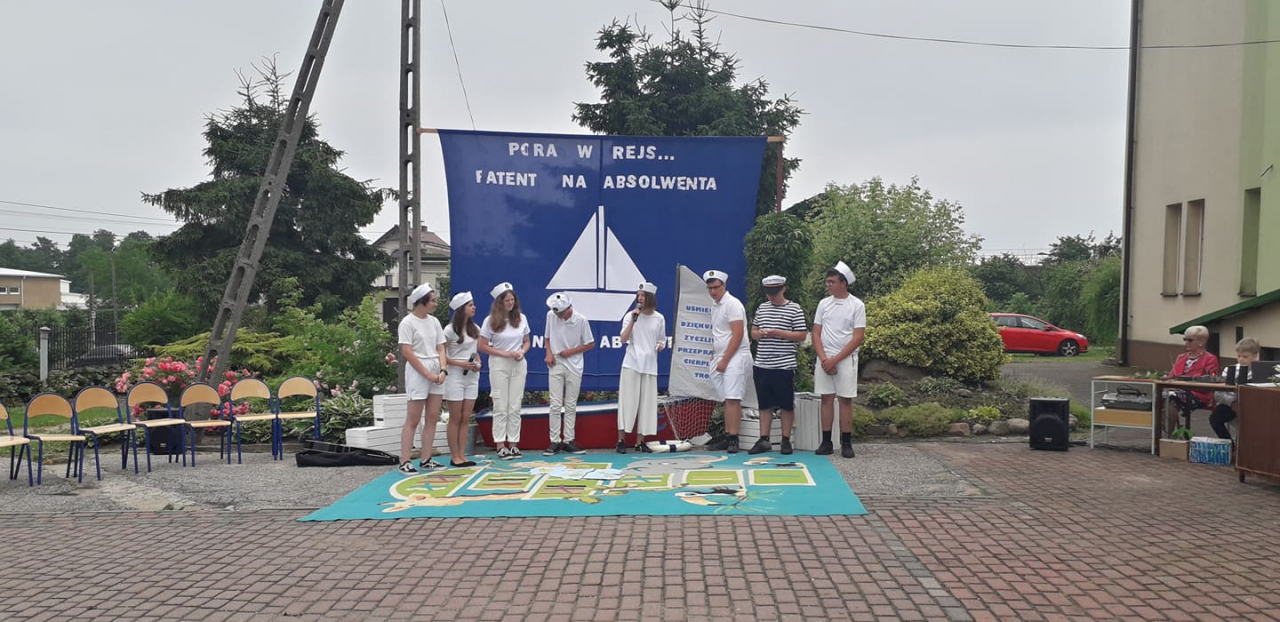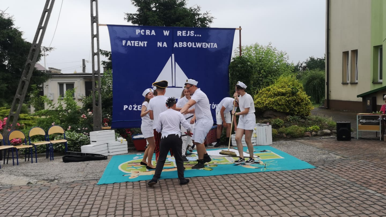 Za nim jeszcze nastąpił koniec uroczystości po raz ostatni na scenie zaprezentowali się uczniowie klasy 8 w inscenizacji pt.” Pora w rejs… Patent na absolwenta”