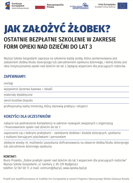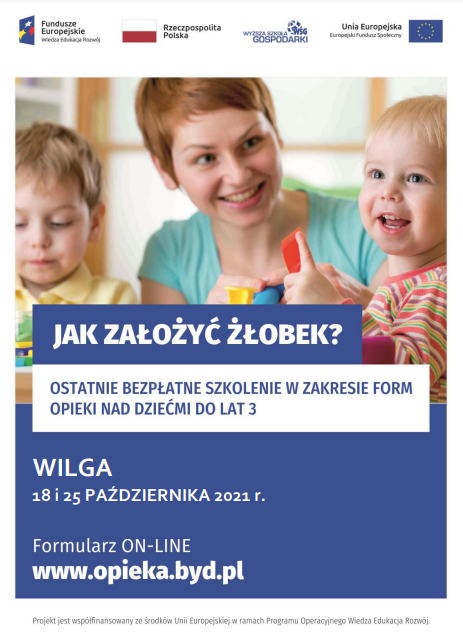 Wyższa Szkoła Gospodarki z przyjemnością informuje, że w Wildze w terminie 18 i 25.10.2021 r. odbędzie się bezpłatne szkolenie „Jak założyć żłobek. Misja, wizja i biznes”, realizowane w ramach projektu „Dobre praktyki opieki nad dziećmi do lat 3 wsparciem dla pracujących rodziców”. Jest to ostatnia możliwość zdobycia wiedzy w tym obszarze przez mieszkańców Gminy bez ponoszenia kosztów.