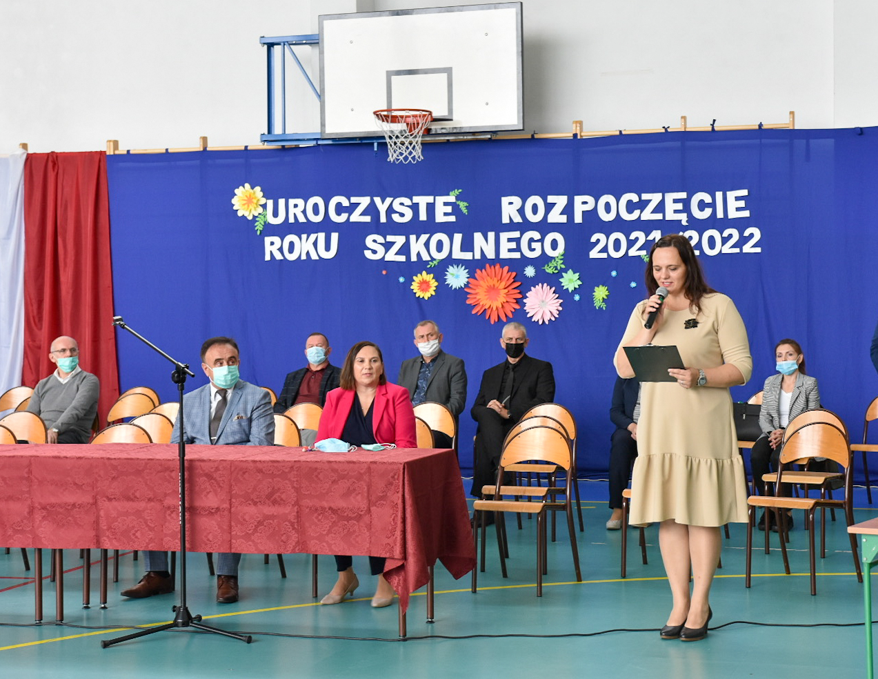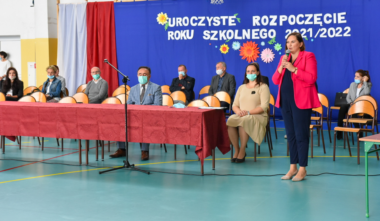 Po wprowadzeniu sztandaru i odśpiewaniu Hymnu Państwowego głos zabrała Dyrektor Szkoły – Renata Śmiechowska. Powitała wszystkich uczniów i pracowników. Szczególnie ciepłe słowa skierowała do uczennic i uczniów klas pierwszych. Przywołała m. in. słowa znakomitego polskiego pisarza Stefana Żeromskiego: Nauka jest jak niezmierne morze... Im więcej pijesz,