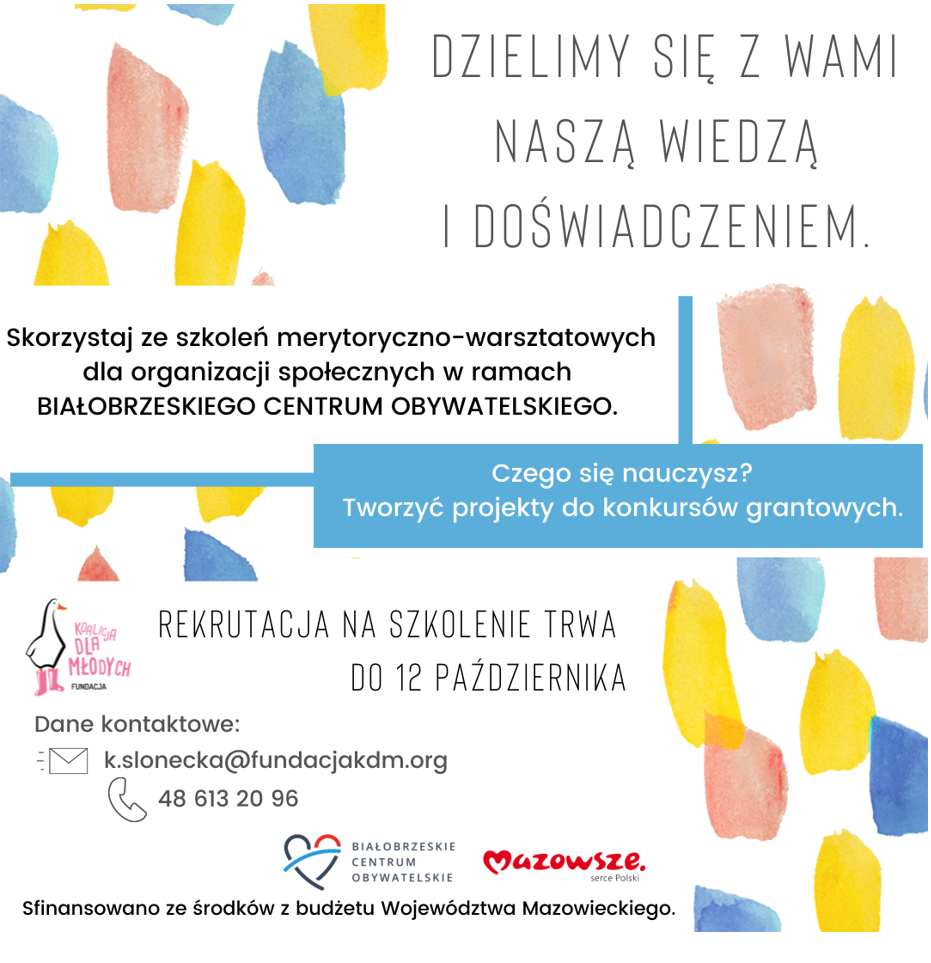Zgłoszenia organizacji na szkolenie przyjmujemy do 12 października 2021 roku pod adresem mailowym: k.slonecka@fundacjakdm.org