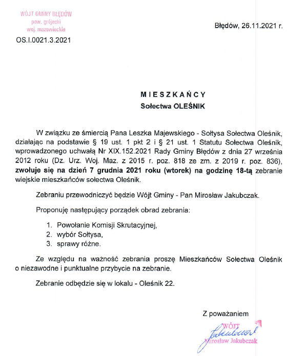 Ogłoszenie w sprawie przeprowadzenia wyborów sołtysa wsi Oleśnik