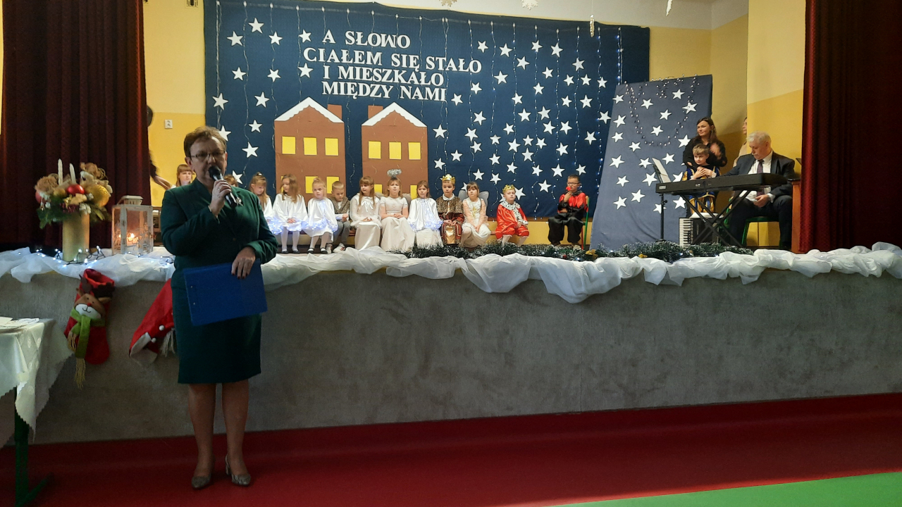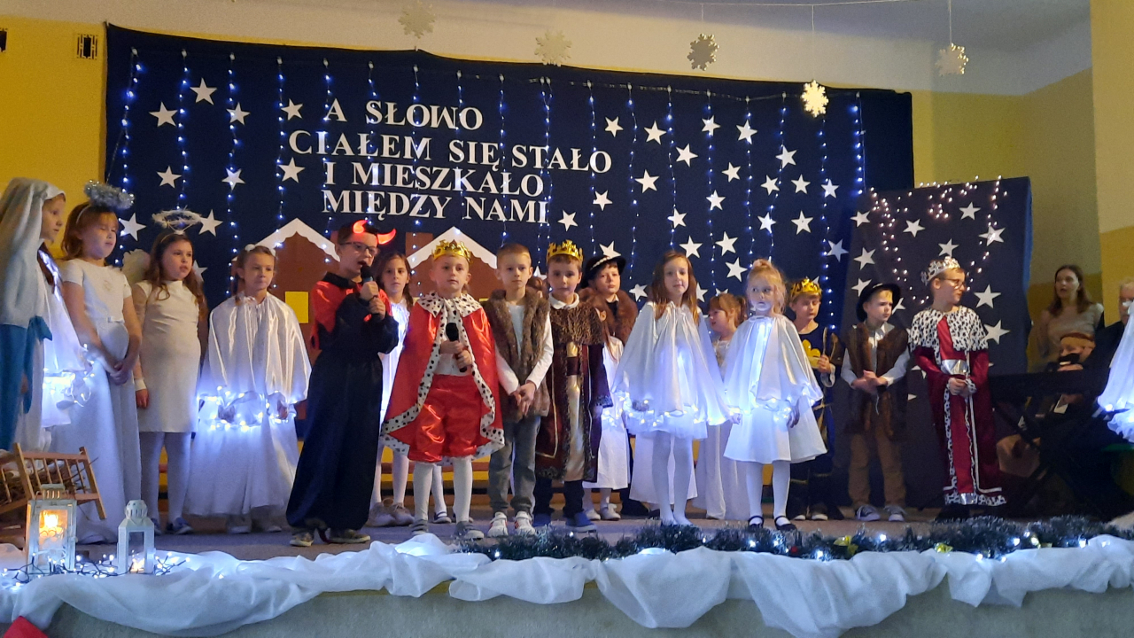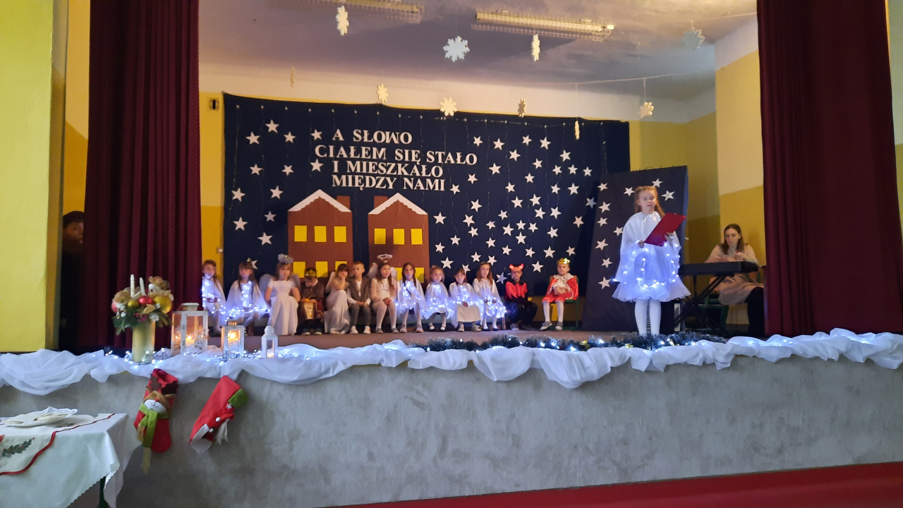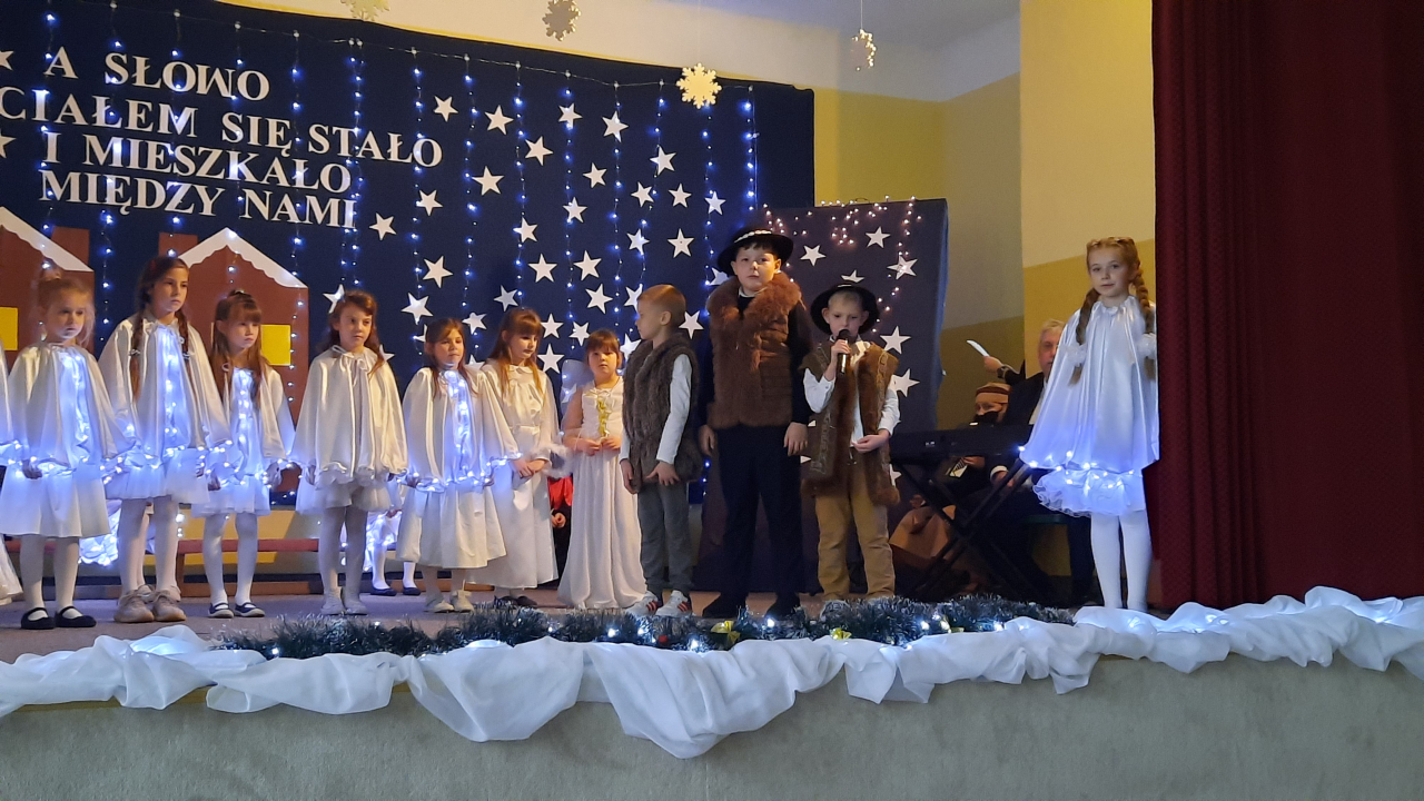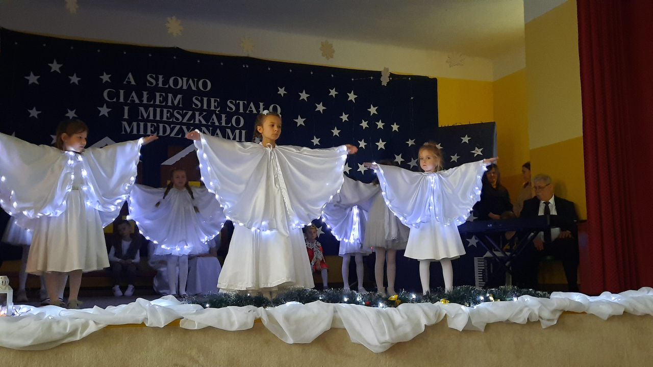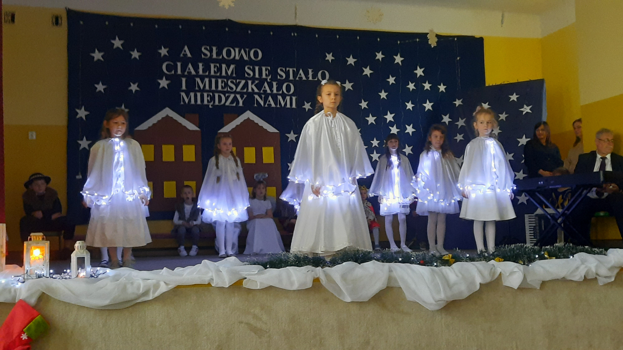 Tradycyjnie pierwsza część wieczornicy to przedstawienie jasełkowe, które tym razem zostało rozpoczęte „tańcem aniołów” w wykonaniu uczennic klasy pierwszej i drugiej przy pięknej scenerii z piękną choreografią. Jasełka w wykonaniu uczniów klasy I i II zostało wcześniej zaprezentowane społeczności szkolnej podczas tradycyjnej szkolnej wigilii – 17 grudnia 2021 r.