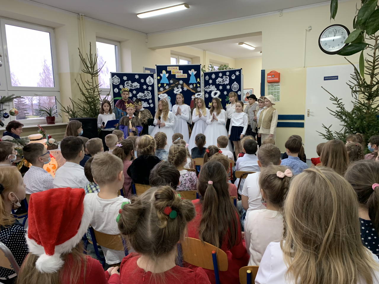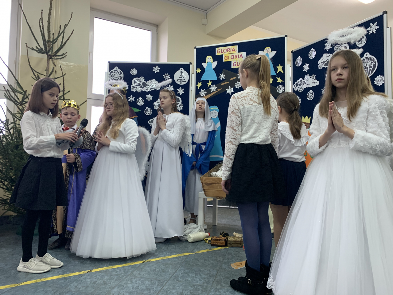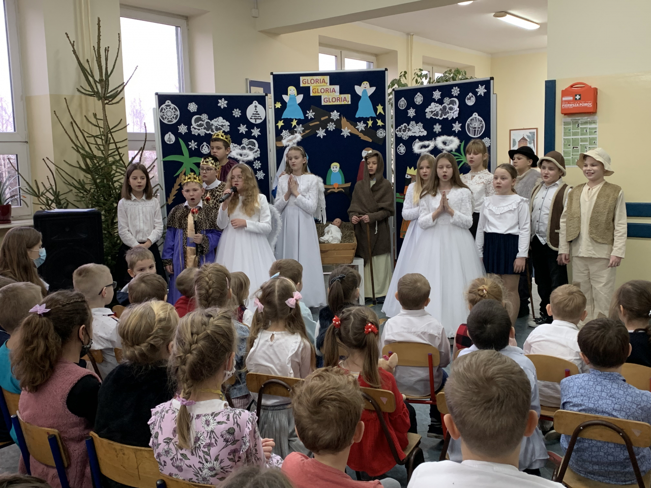 Dnia 22 grudnia 2021 r. w Publicznej szkole Podstawowej im. ks. Mariana Panka w Wilkowie odbyły się jasełka w wykonaniu klasy IV. Wszyscy uczniowie na scenie w pięknych strojach.