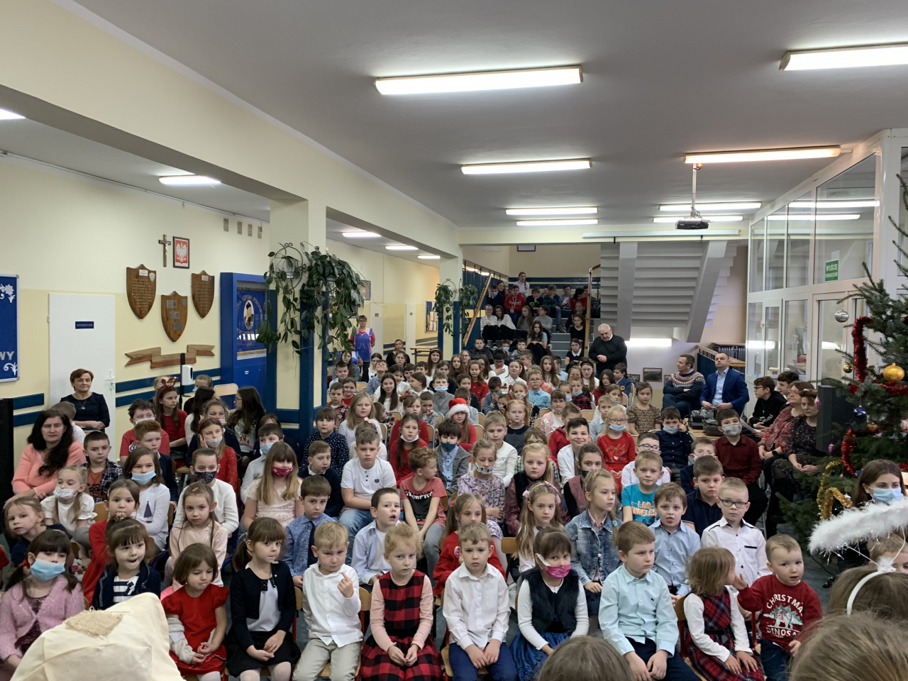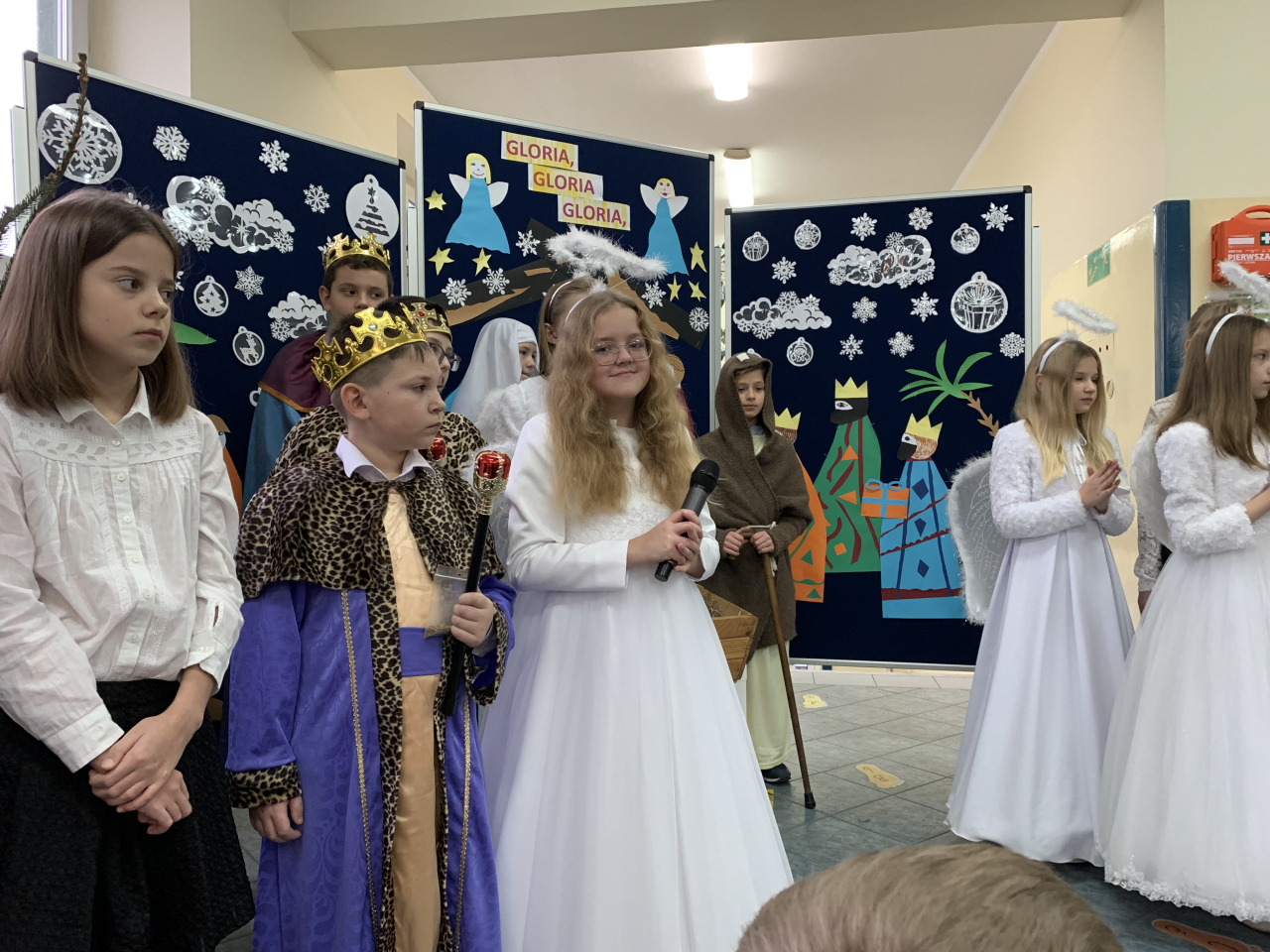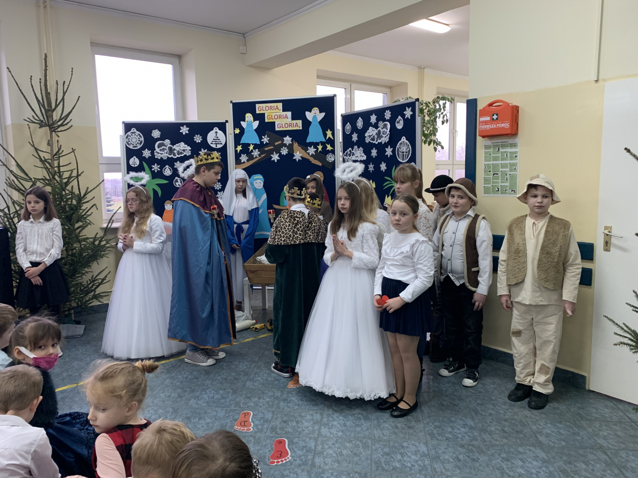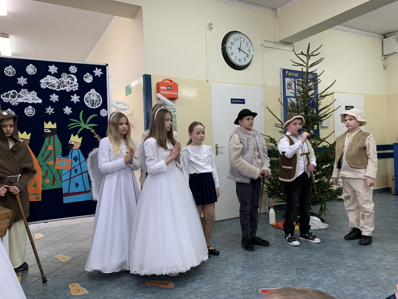 Dnia 22 grudnia 2021 r. w Publicznej szkole Podstawowej im. ks. Mariana Panka w Wilkowie odbyły się jasełka w wykonaniu klasy IV. Wszyscy uczniowie na scenie w pięknych strojach.
