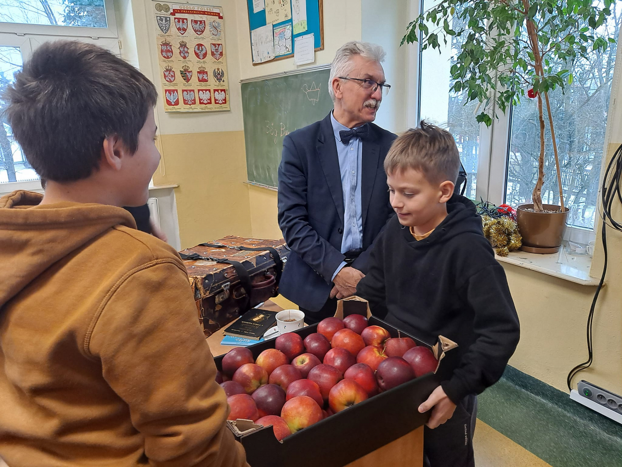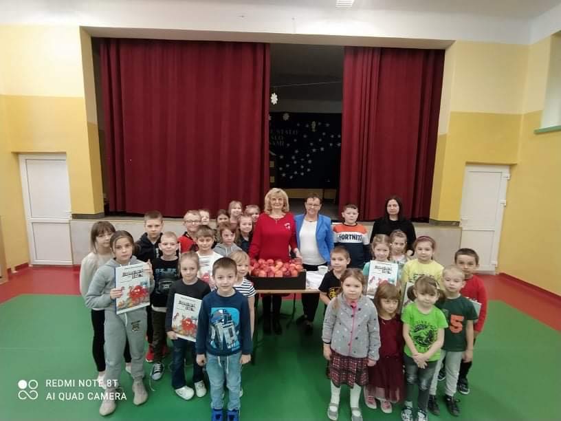 Na zakończenie dzieci mogły zakupić książkę z autografem gościa. Autorka w ramach podziękowań otrzymała od organizatorów jabłka z naszych sadów. Pani Hania z otrzymanego „bukietu” bardzo się ucieszyła i podkreśliła, że nigdy takiego podziękowania nie otrzymała, i że bardzo, bardzo dziękuje za tak oryginalne podziękowanie.