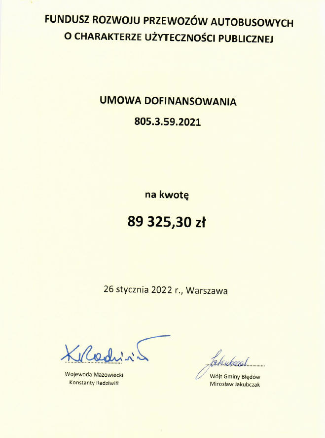 Dzięki wczoraj podpisanej umowie dotacyjnej z Panem Wojewodą Mazowieckim Konstantym Radziwiłłem Gmina Błędów pozyskała dofinansowanie przewozów autobusowych. Nasza gmina w uzyskała dopłatę do ceny usługi przewozów autobusowych w kwocie 89 325,30. Jest wsparcie w ramach Funduszu Rozwoju Przewozów Autobusowych o charakterze użyteczności publicznej. Umowę dofinansowania dla naszej gminy podpisali Pan Wójt Mirosław Jakubczak wraz z Panią Angeliką Szmulską Skarbnikiem Gminy.