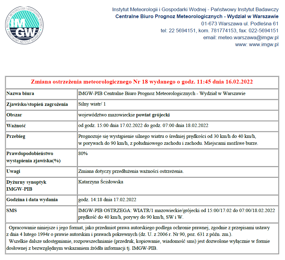 Zmiana ostrzeżenia meteorologicznego