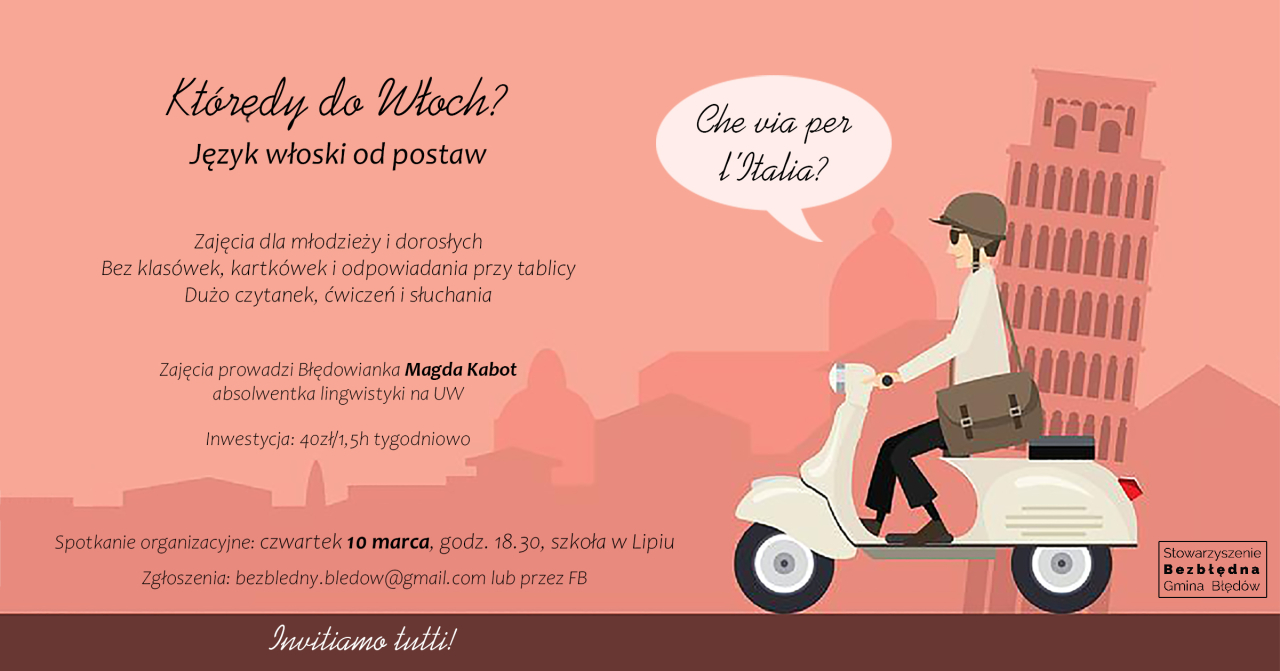 Zajęcia dla młodzieży i dorosłych. Bez klasówek, kartkówek i odpowiadania przy tablicy. Dużo czytanek, słuchania i ćwiczeń. Stowarzyszenie Bezbłędna Gmina Błędów zaprasza na spotkanie organizacyjne dla nowej grupy, nauka języka włoskiego od podstaw - czwartek 10 marca, godz. 18.30 w Szkole w Lipiu (II piętro, sala nr. 7). Zajęcia poprowadzi Błędowianka - Magdalena Kabot, absolwentka italianistyki na UW.