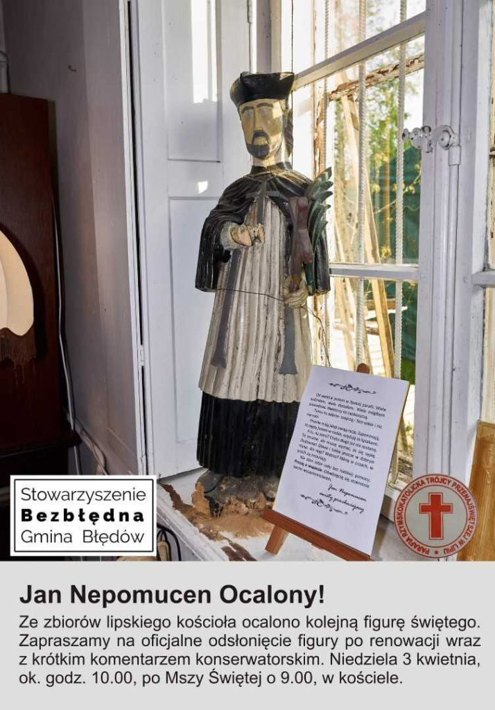 Wszystkich miłośników sztuki, w tym sztuki sakralnej zapraszamy na oficjalne odsłonięcie figury św. Jana Nepomucena po renowacji wraz z krótkim wykładem konserwatorskim. Niedziela, ok. godz. 10.00 w kościele Trójcy Przenajświętszej w Lipiu, po Mszy Świętej o godz. 9.00. Przypominamy o konieczności ubrania się ciepło, gdyż ogromna lipska świątynia jest o tej porze roku bardzo zimna.