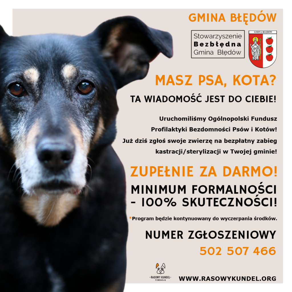Ruszył bezpłatny program sterylizacji i czipowania psów i kotów należących do mieszkańców zameldowanych na terenie Gminy Błędów! Zapisz się już dziś. Kastrując psa lub sukę, kota lub kotkę ograniczysz liczbę zwierząt, które zapełniają polskie schroniska. Według danych Głównego Inspektoratu Weterynarii za 2020r. w schroniskach w Polsce przebywało 92 tyś psów i 32 tyś kotów. Zamiast rozmnażać - adoptuj niechciane i porzucone.
