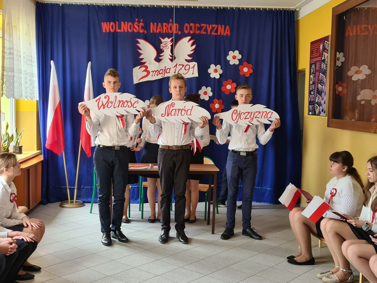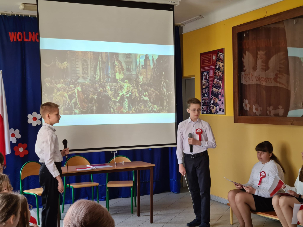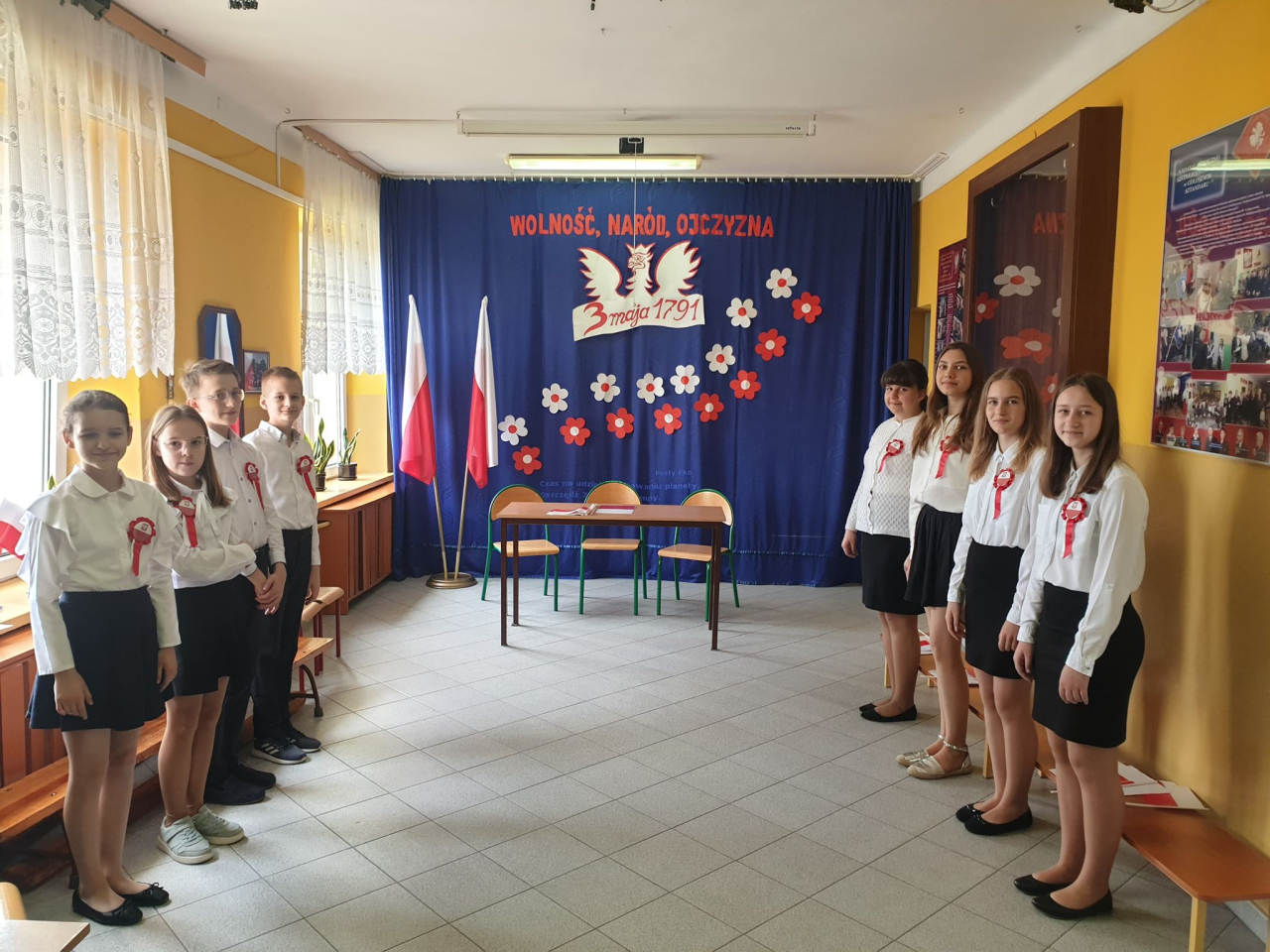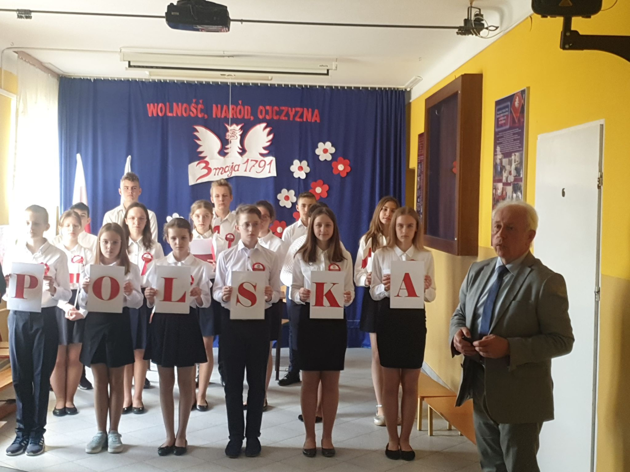 Młodzież kl. VI- VIII w formie sejmiku uczniowskiego przypominała zebranym okoliczności i założenia ważnej dla ówczesnej Polski ustawy rządowej z 1791r. Tę nietypową lekcję historii uatrakcyjniały różne rekwizyty oraz stosowne do tematyki piosenki patriotyczne, a także okolicznościowa scenografia.