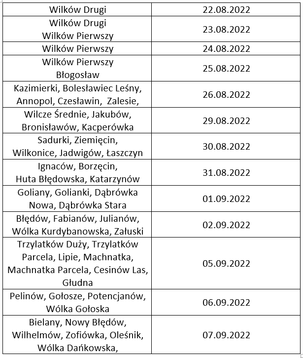 Poniżej przedstawiamy harmonogram prac komisji ds. szacowania szkód powstałych w wyniku gradobicia na terenie Gminy Błędów.