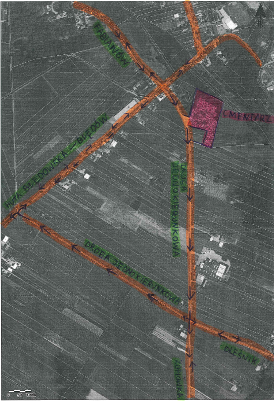 Prosimy o stosowanie się do oznakowania poziomego i pionowego wskazującego kierunki poruszania się w okolicy cmentarza, oraz z zapoznaniem się ze szkicem sytuacyjnym.
