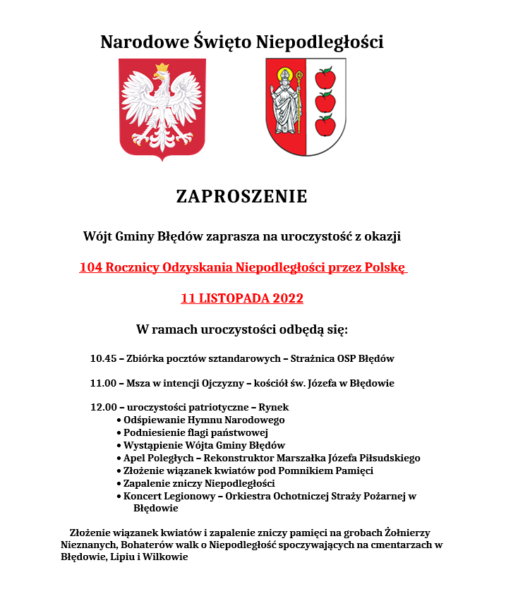 Zaproszenie na obchody Święta Niepodległości 11 listopada