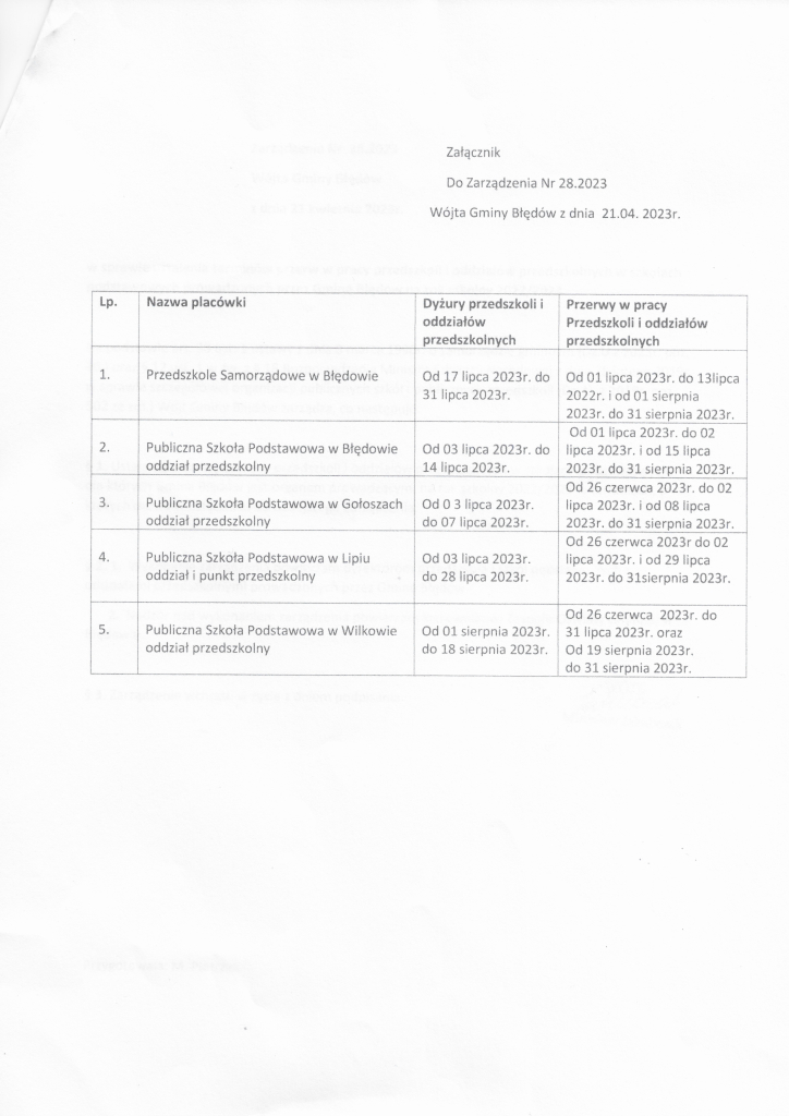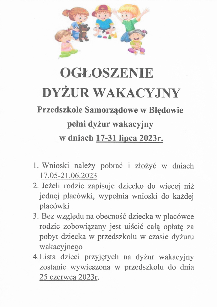 Dyżury wakacyjne przedszkola i oddziałów przedszkolnych