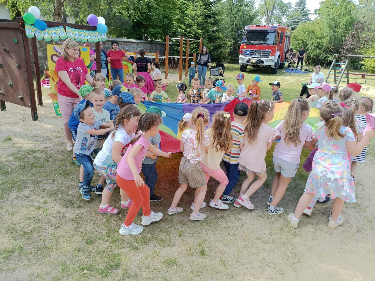 Tego dnia wraz z zaproszonymi animatorkami urządziliśmy przedszkolakom różnorodne zabawy i tańce przy muzyce. Niespodzianką były odwiedziny druhów z OSP Błędów, którzy zaprezentowali wóz i sprzęt strażacki, a nawet umożliwili dzieciom spróbowanie obsługi węża strażackiego. Maluchy mogły poznać specjalistyczne wyposażenie wozu strażackiego: maski, defibrylator, aparaty tlenowe itp. Rodzice przygotowali dzieciom pyszne słodkości i soczki a panie z przedszkola serwowały popcorn.