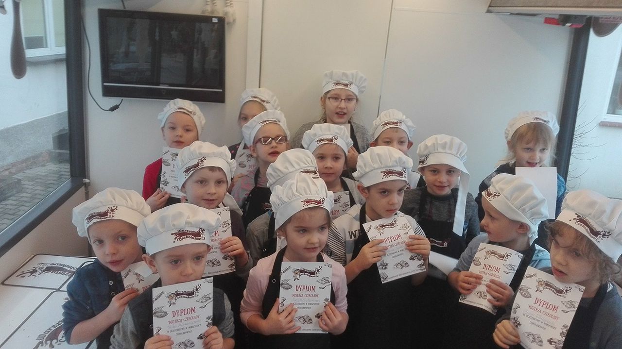 Na zakończenie dzieci otrzymały dyplomy "Mistrzów Czekolady" bo naprawdę spisały się na medal. Zadowolone, uśmiechnięte i bogatsze w nowe doświadczenia wróciły do przedszkola.