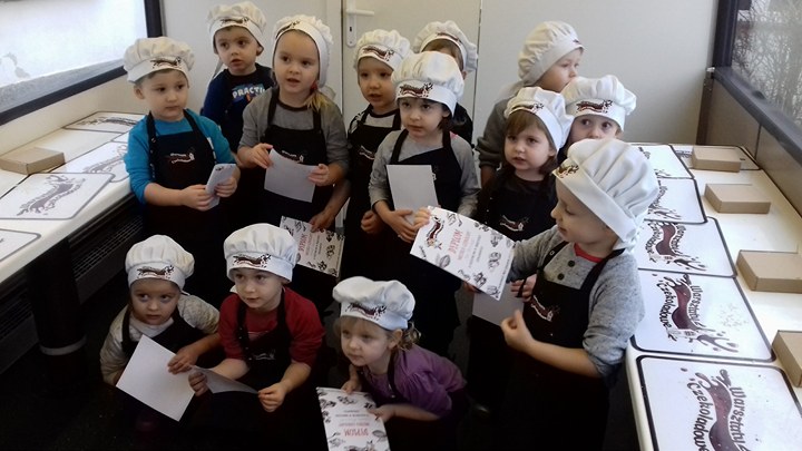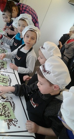 Dzieci otrzymały fartuszki i czapki prawdziwych cukierników. Podczas zajęć dowiedziały się jak i z czego powstaje czekolada. Przeżywały słodką przygodę przez degustację i przelewanie płynnej czekolady do form. Samodzielne tworzenie słodkości sprawiło im wielką frajdę. Ozdabianie przygotowanych przez przedszkolaki zwierzątek, kwiatków i innych przedmiotów to najmilsza część warsztatów.