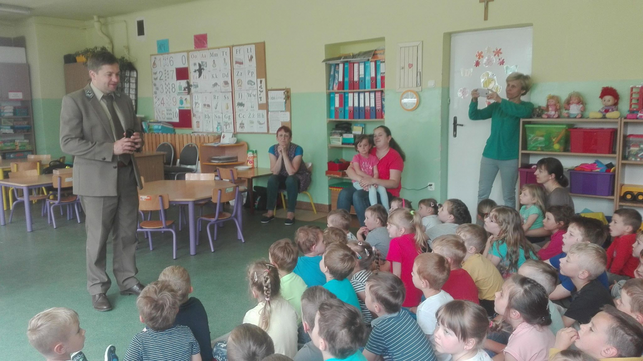 Nasze przedszkole odwiedził również Pan Marcin Ukleja- leśniczy z Nadleśnictwa Grójec. Opowiadał dzieciom o lesie, o bezpieczeństwie na wycieczkach  do lasu, a także poruszył zagadnienia związane z programem "Chroń się przed kleszczami wszelkimi sposobami".