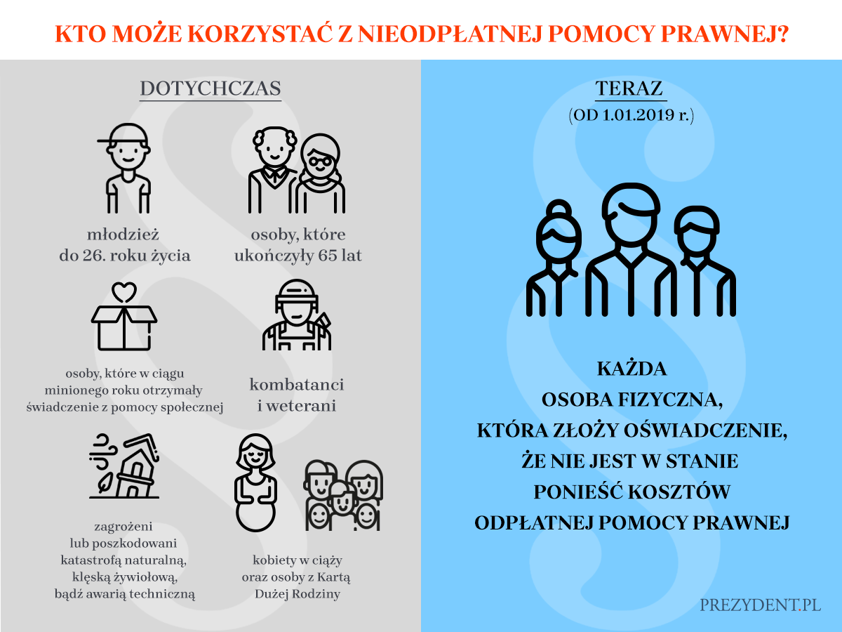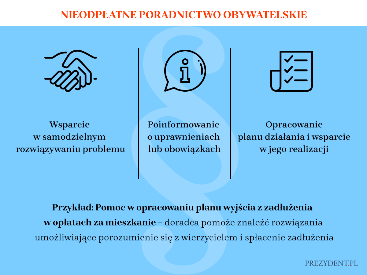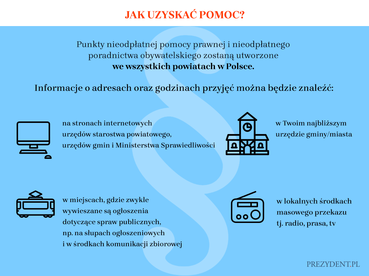 Ustawa o nieodpłatnej pomocy prawnej, nieodpłatnym poradnictwie obywatelskim oraz edukacji prawnej rozwija dotychczasowy system nieodpłatnej pomocy prawnej. Obywatel, dzięki zmianom wprowadzonym z inicjatywy Prezydenta RP, będzie mógł skorzystać z nieodpłatnej pomocy prawnej, nieodpłatnej pomocy obywatelskiej i – w pełnym zakresie za rok – z nieodpłatnej mediacji. Punkty nieodpłatnej pomocy znajdą się we wszystkich powiatach w Polsce.