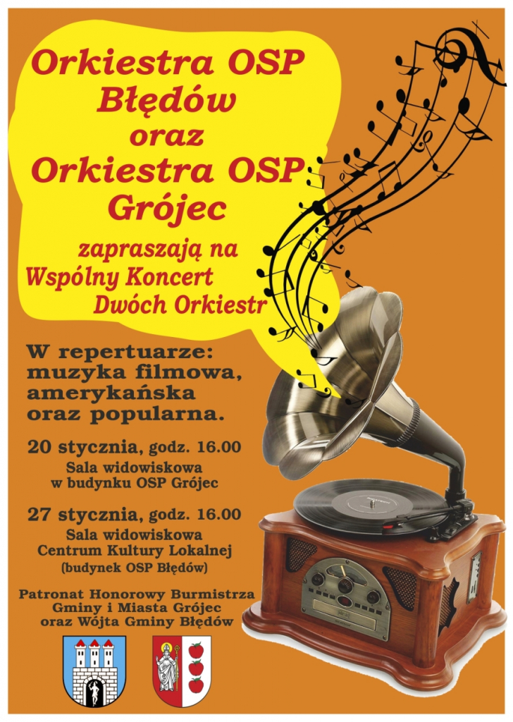 Orkiestra OSP Błędów oraz Orkiestra OSP Grójec zapraszają 27 stycznia o godz. 16.00 do Centrum Kultury Lokalnej (budynek OSP Błędów)  na Wspólny Koncert Dwóch Orkiestr. W repertuarze muzyka: filmowa, amerykańska oraz popularna.