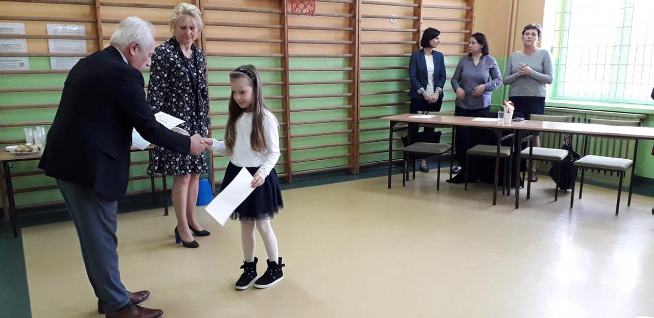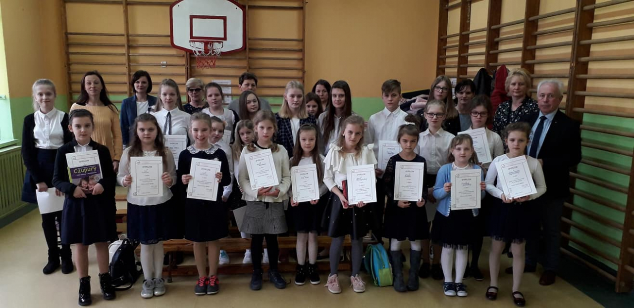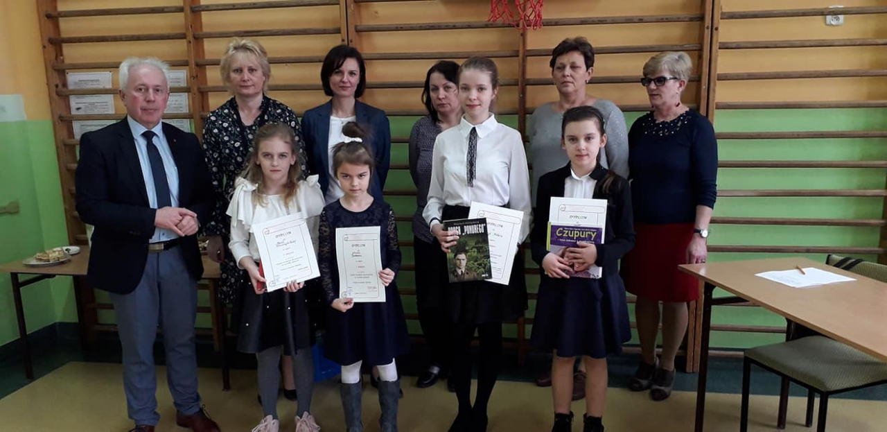 Każdy z uczestników otrzymał pamiątkowe dyplomy, a osoby wyróżnione dodatkowo nagrody książkowe, które z przyjemnością wręczyli – dyr. szkoły Małgorzata Krasuska i sekretarz gminy Błędów- Jacek Adamski.