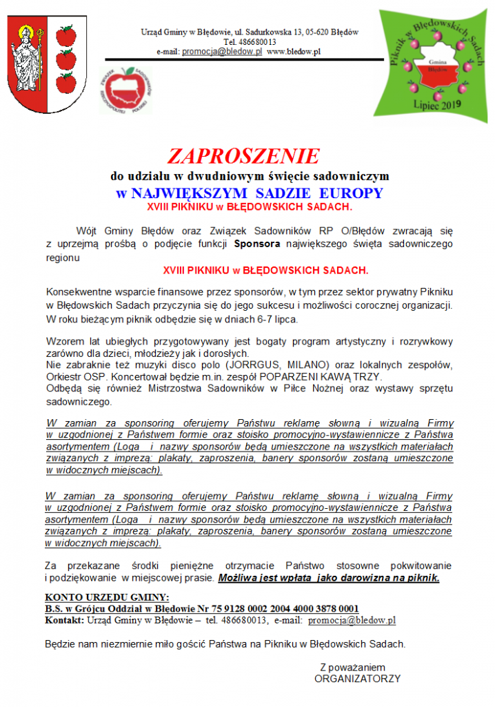 ZAPROSZENIE do udziału w dwudniowym święcie sadowniczym w NAJWIĘKSZYM SADZIE EUROPY -XVIII PIKNIKU w BŁĘDOWSKICH SADACH.