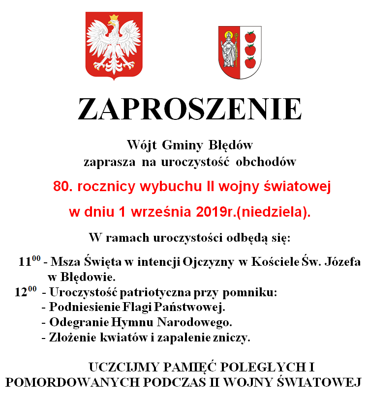 Wójt Gminy Błędów zaprasza na uroczystość obchodów 80. rocznicy wybuchu II wojny światowej