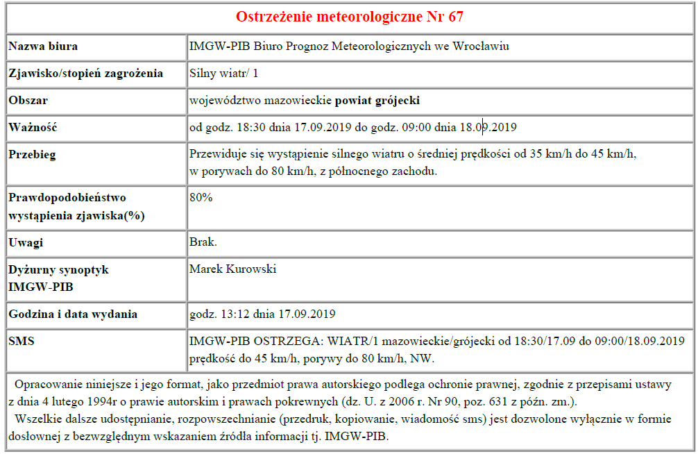 Ostrzeżenie meteorologiczne Nr 67 - Silny wiatr