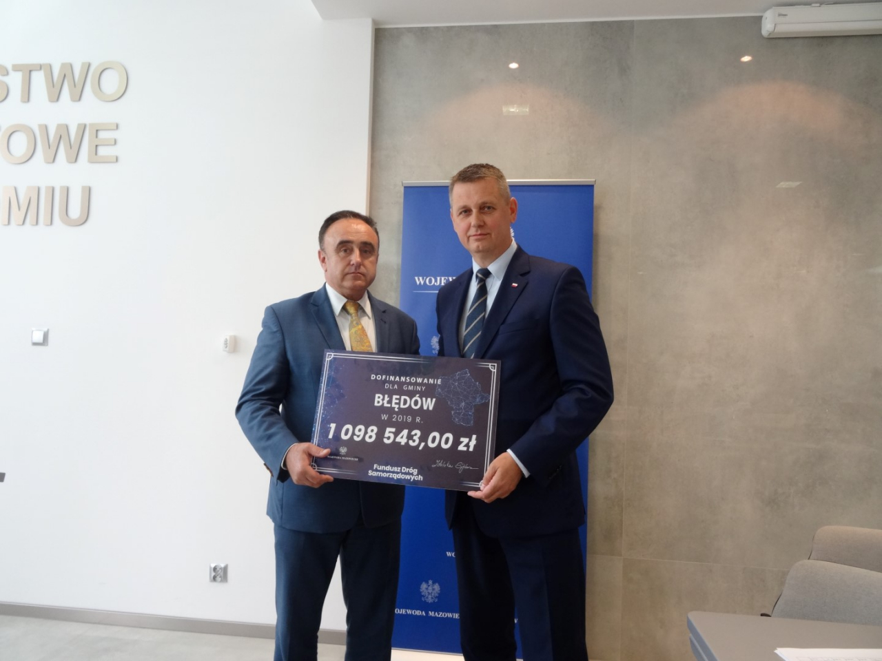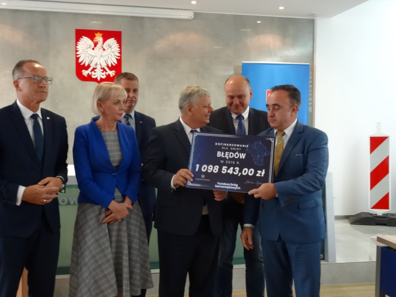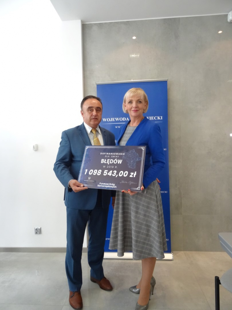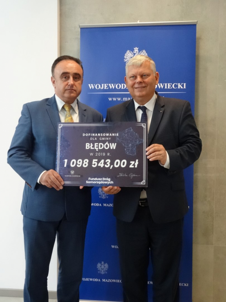 Gmina Błędów otrzymała czek wartości 1 098 543,00 zł. (80% inwestycji) na realizację inwestycji pn: „Przebudowa drogi gminnej Błędów-Jadwigów”.