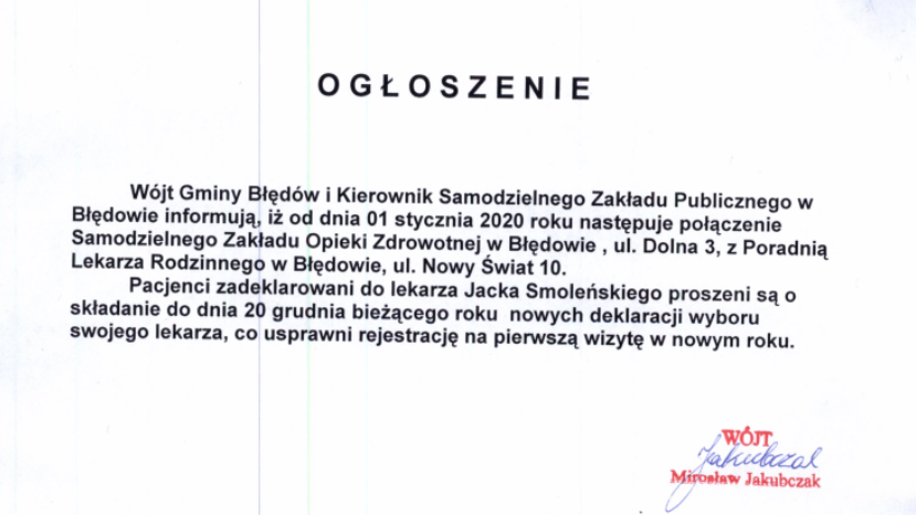 Ogłoszenie Wójta Gminy Błędów w sprawie połączenia ZOZ w Błędowie z Poradnią Lekarza Rodzinnego w Błędowie