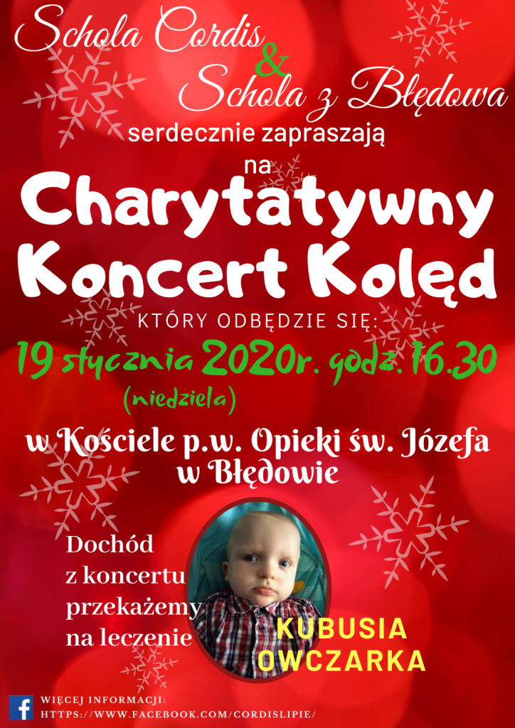 Młodzież ze Scholi Cordis z Lipia oraz Scholi z Błędowa zaprasza na Charytatywny Koncert Kolęd, który odbędzie się 19 stycznia o godz. 16.30 w Kościele pw. Opieki św. Józefa w Błędowie. Około 30 młodych osób z dwóch parafii zaśpiewa 20 kolęd i pastorałek. Towarzyszyć im będzie sekcja grająca – 2 gitary elektroakustyczne, gitara basowa, organy, akordeon i 2 bębny. Podczas koncertu trwać będzie zbiórka do puszek, przeznaczona na diagnostykę i leczenie małego 1,5 rocznego Kubusia Owczarka z Mogielnicy. Chłopczyk ten urodził się z zespołem wad wrodzonych i opóźnieniem psychoruchowym. Przeszedł już kilka zabiegów i operacji, jednak przemożny ból małego ciałka często mu towarzyszy. Wystarczy spojrzeć w oczy tego malutkiego dziecka ze zdjęcia, żeby dostrzec w nich cierpienie. Kochający rodzice i babcia robią wszystko, aby Kubuś się rozwijał i nie cierpiał, jednak potrzebne są znaczne nakłady finansowe na leczenie i rehabilitację chłopczyka. Zapraszamy wszystkich mieszkańców Gminy Błędów i powiatu grójeckiego na błędowski koncert, którym chcemy wesprzeć duchowo i finansowo małego Kubusia.