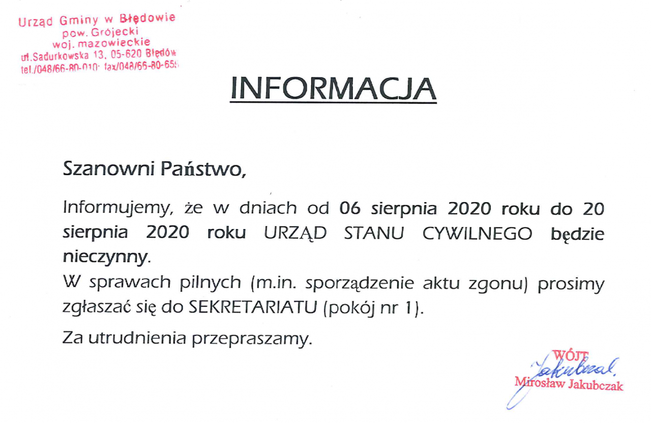 Informacja - w dniach od 6 do 20 sierpnia Urząd Stanu Cywilnego w Błędowie będzie nieczynny